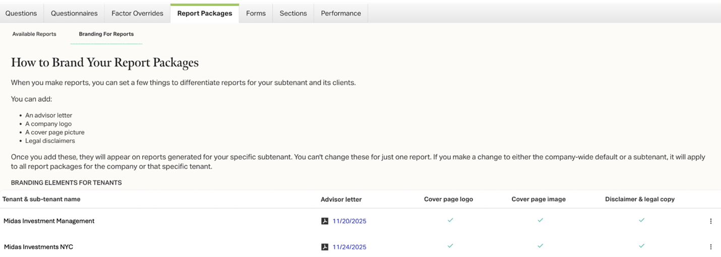 Report Packager branding allows firms to set custom branded elements for each subtenant they operate.