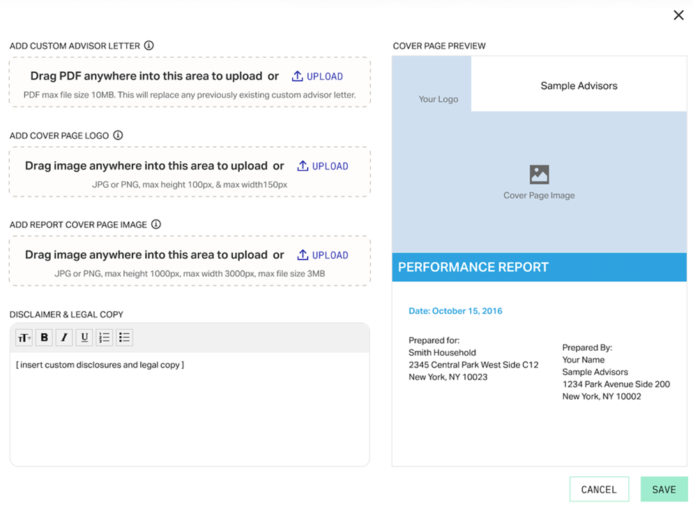 - Advisor letter: This “Dear Client” letter can be used to narrate market developments, convey important information, and highlight your value-added for all households, clients, and accounts that fall under the tenant or subtenant. The most recently uploaded letter will appear on all Report Packages with the Custom Advisor Letter page added.