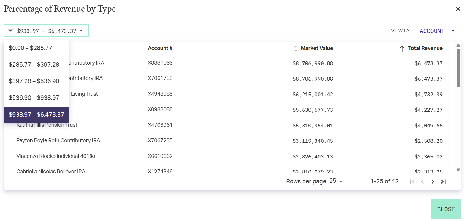 The Percentage of Revenue by Type chart shows period over period comparisons of revenue broken down by quintiles. The chart can show fees by Account, Household, or Advisor using the drop-down in the upper right. Hover over any bar on the chart for a breakdown showing the revenue ranges and exact numbers of accounts, households, or advisors in each quintile.